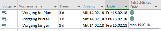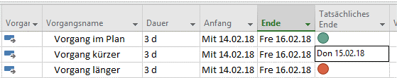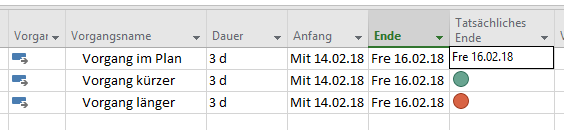 Man könnte für das Feld „Tatsächliches Ende“ (Ende1) eine grafische Visualisierung hinterlegen, welche nach den benannten Kriterien eine rote oder eine grüne Ampel ausgibt. Wenn man mit der Maus über diese Ampel fährt, dann wird das hinterlegte Datum angezeigt: