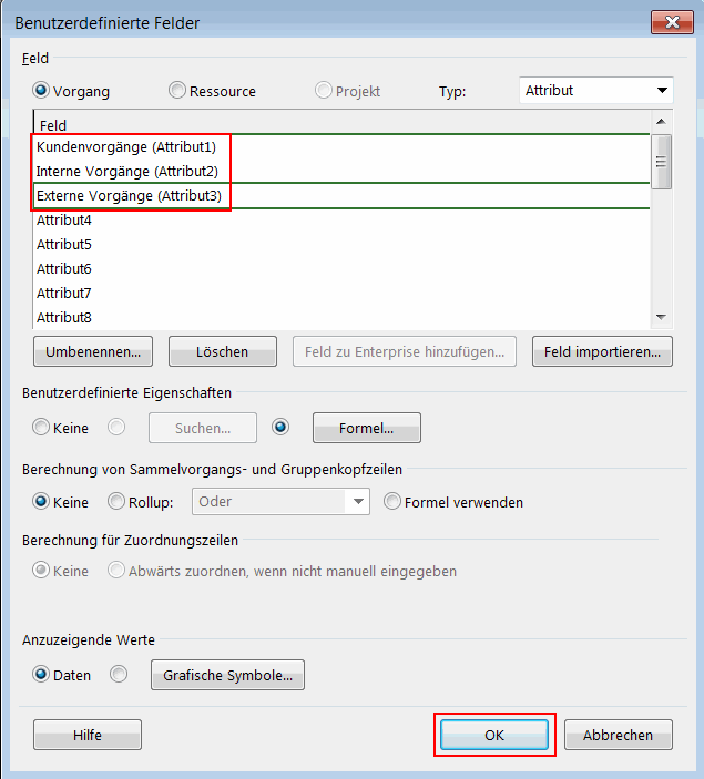 Wählen Sie ein Feld Vorgang mit Typ Attribut aus. Selektieren Sie ein noch nicht belegtes Attributfeld z.B. Attribut1 und klicken Sie auf Umbenennen. Nennen Sie das Feld in „Kundenvorgänge“ um und bestätigen Sie die Änderung mit OK.