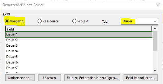 Klicken Sie auf die Registerkarte Projekt und aktivieren Sie die Schaltfläche Benutzerdefinierte Felder. Stellen Sie sicher, dass der Feldtyp Vorgang ausgewählt ist. Wählen Sie im Dropdown (oben rechts) den Datentyp Dauer aus.