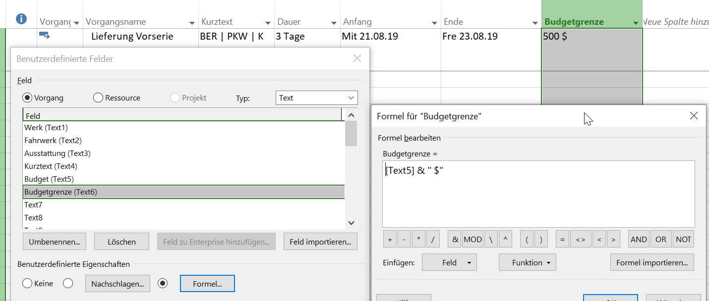 Variante 3: MS Project benutzerdefiniertes Feld mit Formel anlegen