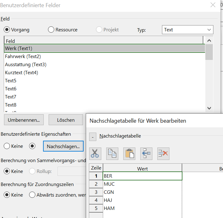 Variante 2: MS Project Nachschlagetabelle / Auswahlliste für Felder anlegen