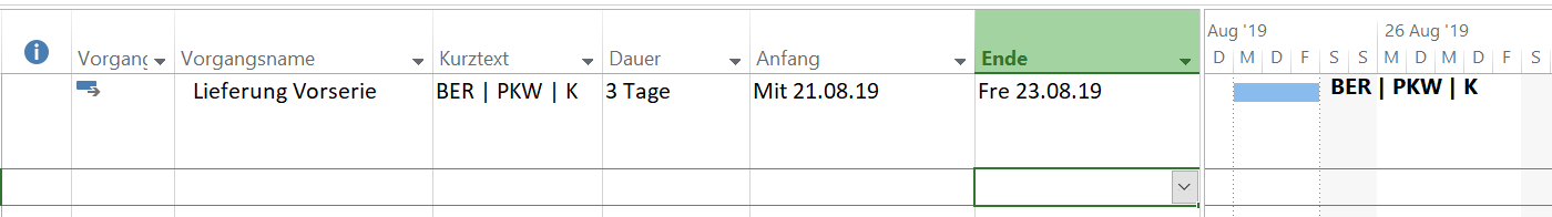 Nun meine Frage: kann ich definieren, dass im Gantt-Diagramm für die entsprechenden Balken meine neu berechnete Dauer verwendet wird und nicht die Spalte „Dauer“?