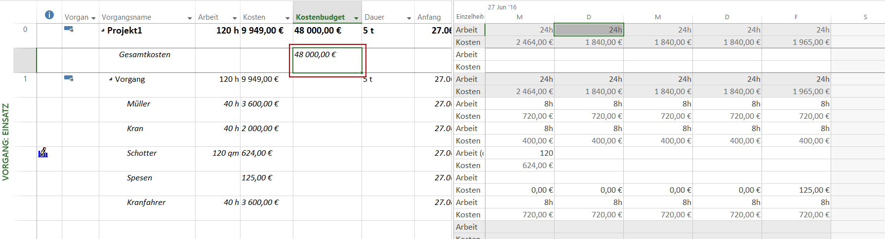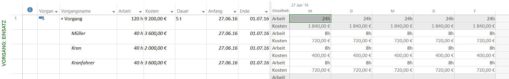 In der letzten Grafik arbeitet die Ressource Müller zu einem Stundensatz von 95 € von Montag bis Freitag 8 Stunden pro Tag auf dem Vorgang. Zudem ist ein weiterer Kranführer mit dem gleichen Stundensatz für diese Tätigkeit vorgesehen, der noch nicht namentlich bekannt ist.
