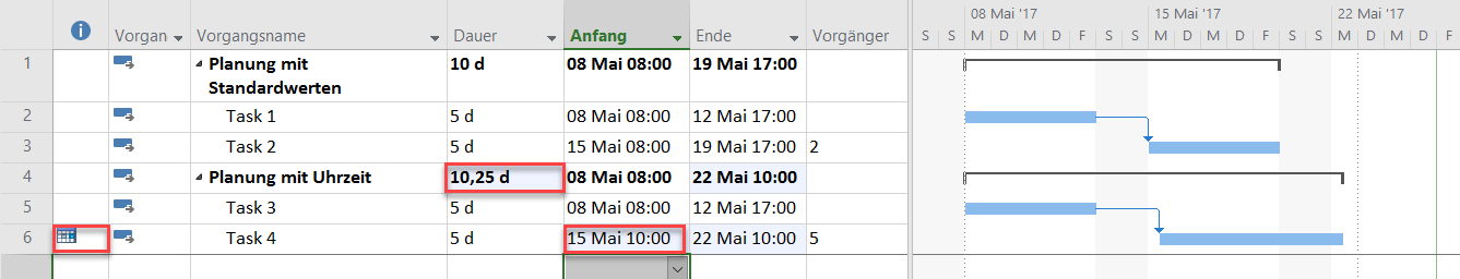 Die Dauer des Sammelvorgangs Planung mit Uhrzeit wird von MS Project hingegen mit 10,25 Tagen berechnet, da der Vorgang Task 4 am 22. Mai um 10:00 endet.