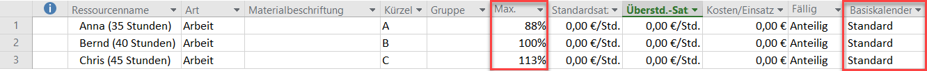 Wichtig: Beim Anlegen der Ressourcen in der Ressourcentabelle wird den Ressourcen automatisch der Projektkalender (also Standard) als Basiskalender (Ressourcenkalender) zugewiesen.