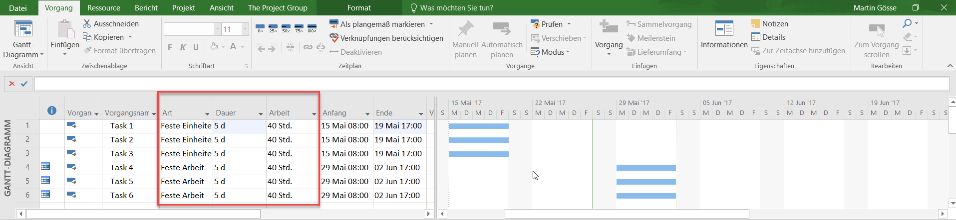 Die Vorgangsarten für die Vorgänge habe ich über die Spalte Art ausgewählt, so dass zwei Vorgangsarten (Feste Einheiten und Feste Arbeit) zur Anwendung kommen.