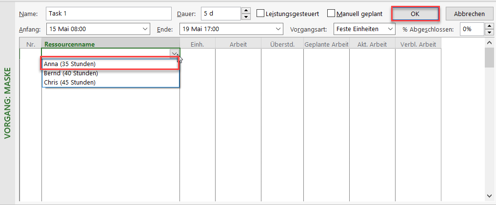 Im abgebildeten Fall wurde Anna auf den Task 1 mit 88% zugewiesen. Bei der Zuordnung von Anna und Bernd werden die Einheiten von 88% bzw. 100% automatisch übernommen. Im Falle der Zuweisung von Chris müssen Sie den Wert 113% eintragen.