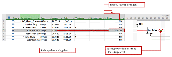 Aber keine Sorge: MS Project signalisiert in der Indikatorspalte sehr deutlich, wenn ein Stichtag nach aktuellem Planungsstand „gerissen“ wird. Damit können Sie als Projektleitung frühzeitig entsprechende Gegenmaßnahmen einleiten. Außerdem wird der Stichtag im Gantt-Diagramm mit einem grafischen Indikator (grüner Pfeil) angezeigt.