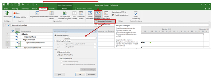 Und so geht’s: Um einen Basisplan festzulegen, wechseln Sie in die Registerkarte Projekt und aktivieren die Schaltfläche Basisplan festlegen. Wählen Sie den Basisplan aus, den Sie festlegen möchten, und bestätigen Sie sie anschließend mit OK. Es ist auch möglich, nur bestimmte Vorgänge im Basisplan zu speichern.