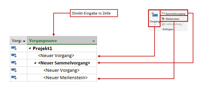 Natürlich bietet MS Project verschiedene Möglichkeiten, Vorgänge anzulegen. Sie können Vorgangsnamen in der Eingabetabelle eingeben oder Schaltflächen in der Registerkarte Vorgang verwenden.