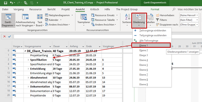 Wenn Sie zum Beispiel nur einen Überblick über die Phasen wünschen, können Sie die Ansicht ganz einfach auf die erste Gliederungsebene beschränken. Wechseln Sie dazu in die Registerkarte Ansicht und aktivieren Sie die Schaltfläche Gliederung. Wählen Sie anschließend die gewünschte Gliederungsebene aus.