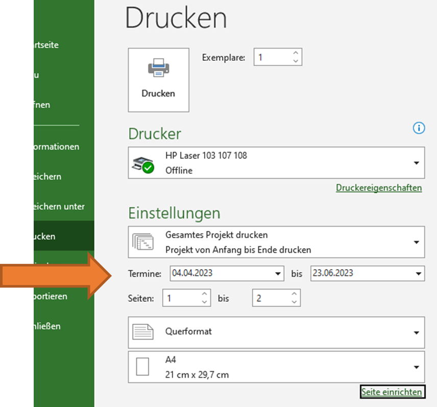 Wir sind weiterhin in der Druckvorschau. Passen Sie nun die Zeile „Termin“ an. Dies können Sie im linken Auswahlfeld tun. Bestimmen Sie den Termin, ab dem der Balkenplan angezeigt werden soll.