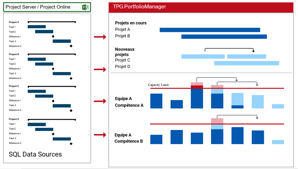 Une gestion de portefeuille de projets intégrée vous permet d’identifier la disponibilité réelle des ressources pour les projets. Vous pouvez voir les besoins en ressources pour les projets en cours et les nouveaux projets.