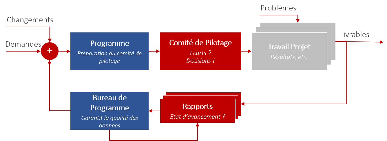 - Le contrôle est primordial : assurez-vous que des processus de gestion de programme pour la gestion de projets individuels et pour le traitement des réunions du comité de pilotage soient clairement définis et respectés.