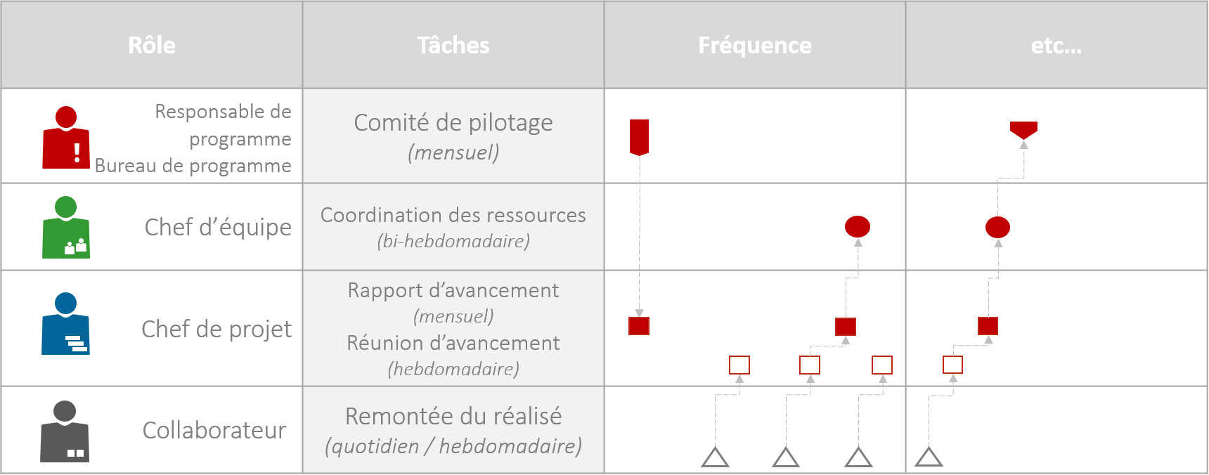 Les intervalles entre les réunions doivent être en rapport avec le calendrier du programme. Cela vous permet d’identifier tout écart, de déterminer les actions nécessaires et de les communiquer aux personnes/entités concernées pour assurer le succès du programme.