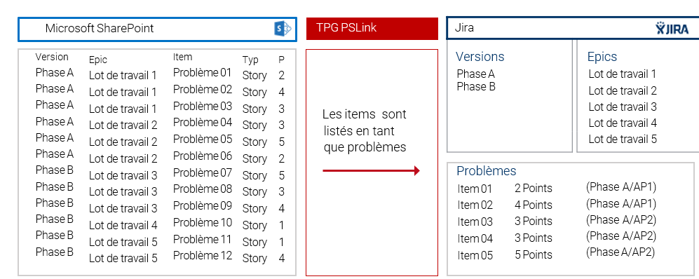 SharePoint est un excellent outil pour mettre facilement à disposition une liste de problèmes par type de projet. Pour les nouveaux projets, un outil d’intégration adapté vous permettra de transposer cette liste dans Jira en un simple clic. Cela vous fera gagner beaucoup de temps.