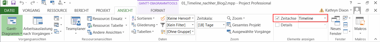 Wählen Sie nun Ihre neue Zeitachse aus dem Menü auf dem Reiter Ansicht aus.