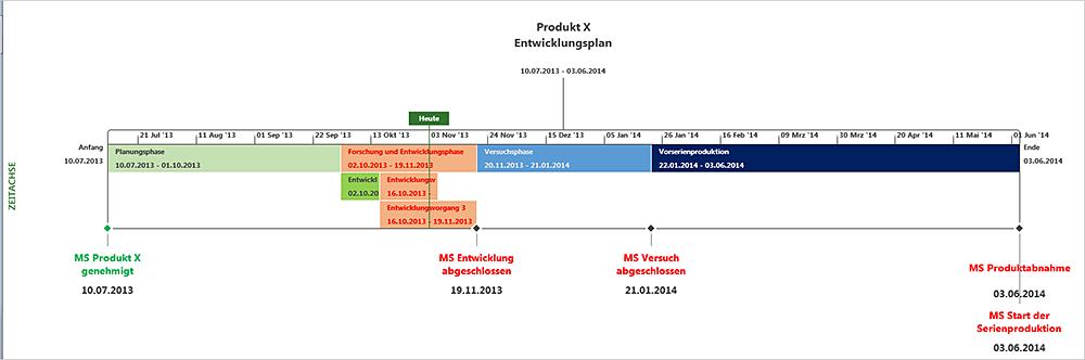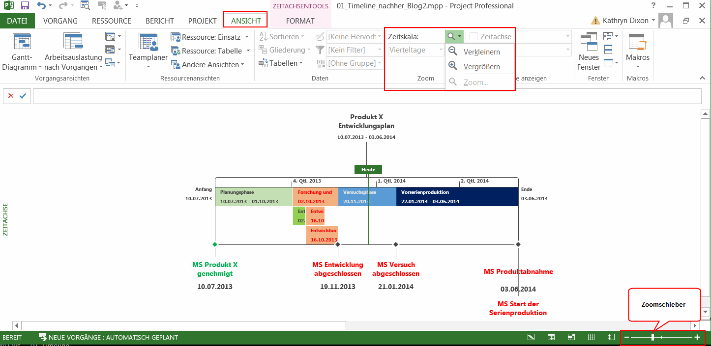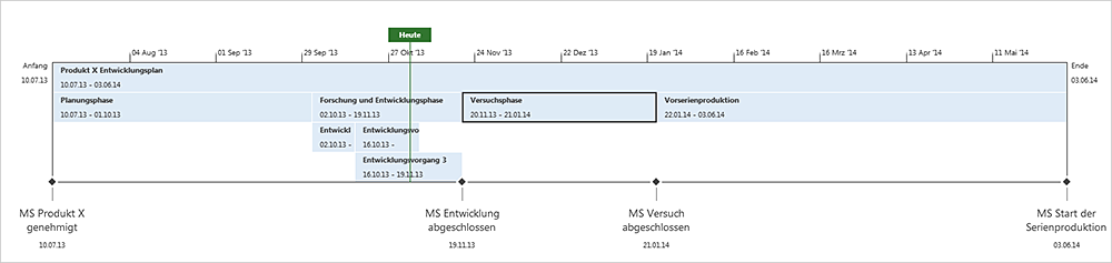 Bild 1: Formatierte Zeitachse mit Phasen, Meilensteinen und ausgewählten Vorgängen