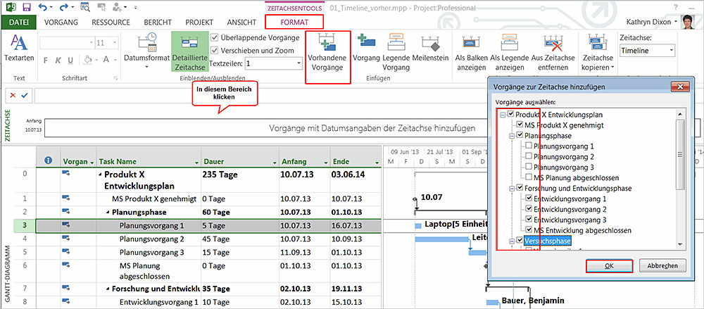 Unser Profitipp: Wählen Sie den Reiter Format aus und klicken Sie in dem Bereich Zeitachse, um die besonderen Formatierungsmöglichkeiten für die Zeitachse zu aktivieren. Anschließend klicken Sie auf „Vorhandene Vorgänge“. Es öffnet sich ein Dialogfenster mit Ihrer gesamten Projektplanstruktur. Nun können Sie die benötigten Vorgänge einfach ankreuzen und Ihre Auswahl mit OK bestätigen.