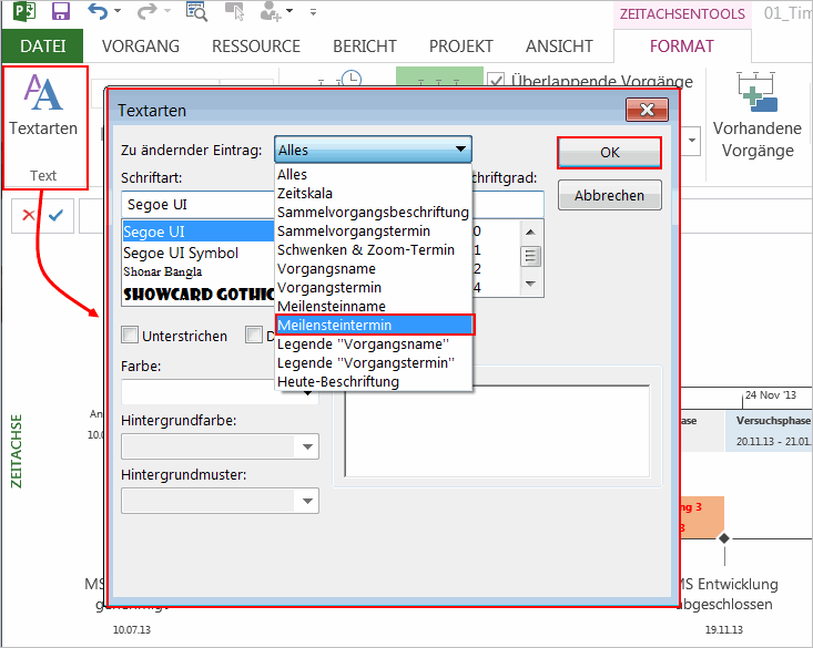 Es gibt mehrere Möglichkeiten zur MS Project Zeitachsen-Formatierung. Wichtig ist, dass Sie vorher, wie oben beschrieben, die speziellen Formatierungsfunktionen für die Zeitachse aktiviert haben. Wir zeigen Ihnen hier nur ein paar Möglichkeiten.