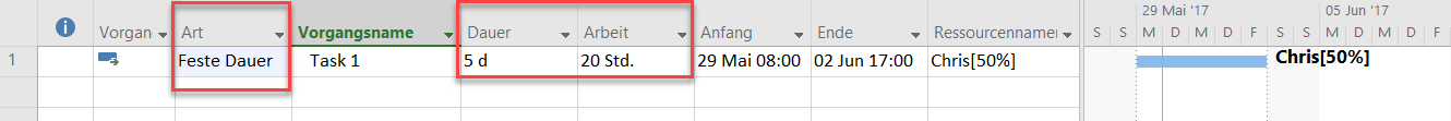 Die folgende Abbildung stellt die Ausgangssituation dar. Chris soll 20 Stunden Arbeit in 5 Tagen erledigen. Der Zuweisungswert von Chris auf den Vorgang beträgt somit 50%.