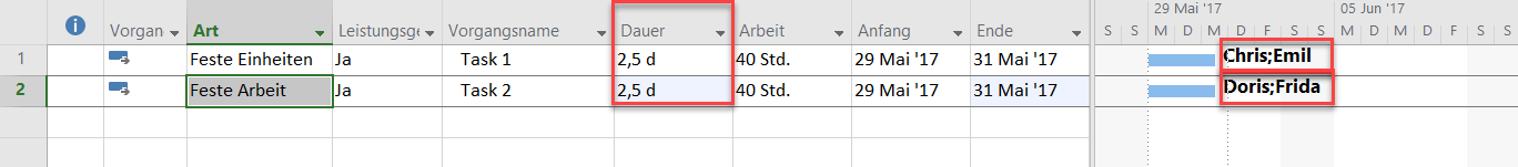 Weisen Sie nun den Vorgängen je eine weitere Ressource zu, so reduziert sich logischerweise die Dauer der Vorgänge auf 2,5 Tage. Jetzt wird das Arbeitsvolumen des Vorgangs von zwei Ressourcen erledigt – mit je 20h Arbeit pro Ressource.
