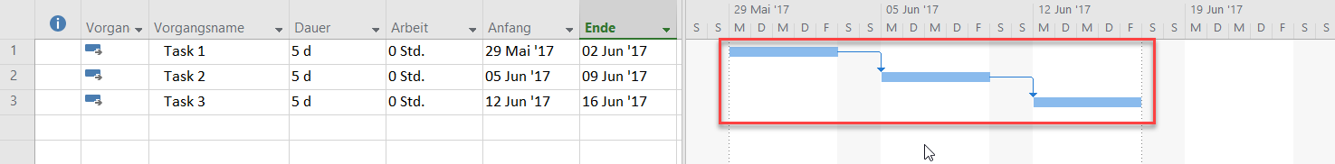 In der Ausgangssituation sind die Vorgänge Task 1, 2 und 3 (Zeile 1, 2 und 3) bereits miteinander verknüpft.