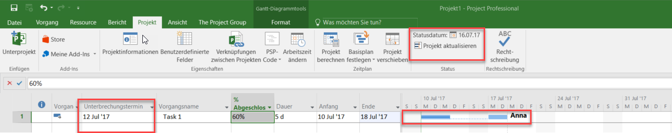 Sie erfassen also einen Fortschritt 60% im Feld % Abgeschlossen. In der Spalte Unterbrechungstermin, die ich zur Verdeutlichung eingeblendet habe, wird der 12. Juli 2017 als Unterbrechungsdatum angezeigt, da Anna am 10., 11. und 12. Juli gearbeitet hat.