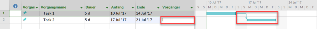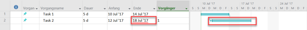 - Bei Task 2 verschiebt sich das Ende auf den 24. Juli. Das ist der nächstgelegene Arbeitstag für das Ende dieses Vorgangs.