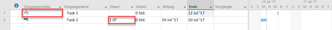 Im Falle manuell geplanter Vorgänge erscheint das Fragezeichen in der Spalte Vorgangsmodus. Das Fragezeichen erscheint nicht mehr, wenn Sie die Dauer des Vorgangs editieren oder einen Anfangs- und einen Endtermin für den Vorgang erfassen.