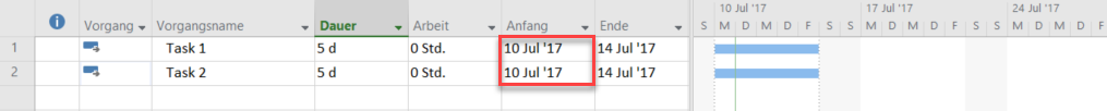 Für den Fall der Deaktivierung der Option würden beim Ändern des Planungsmodus von manuell auf automatisch geplant beide Vorgänge am 10. Juli, dem Projektstarttermin, beginnen.
