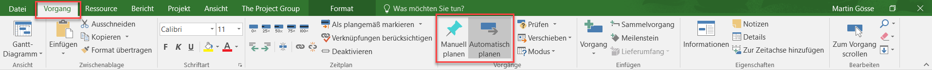In diesem Modus können Sie Anfangs und Endtermine frei eingeben und „Excel-like“ Ihren Projektplan entwickeln, ohne dass ständig im Hintergrund Berechnungen ausgeführt werden. Manuell geplant ist die Standardeinstellung von MS Project.