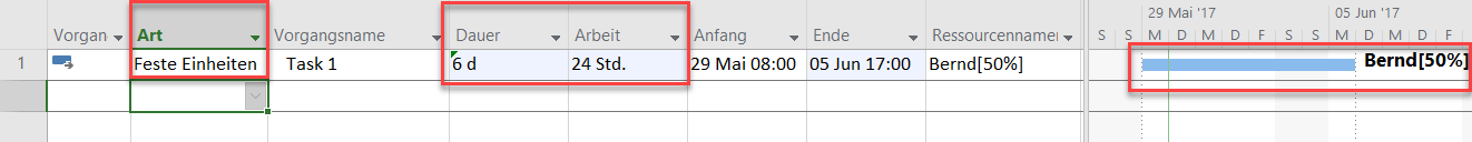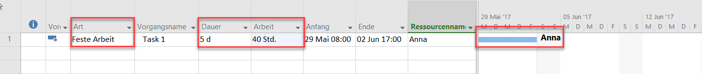 Wenn die Dauer eines Vorgangs vorgegeben ist und dann eine Ressource mit festem Einheitenwert zugewiesen wird, berechnet MS Project die Arbeit. Wird einem Vorgang mit einer Dauer von 5 Tagen eine Ressource zu 100% zugewiesen, ergibt sich ein Arbeitsvolumen in Höhe von 40 Stunden.