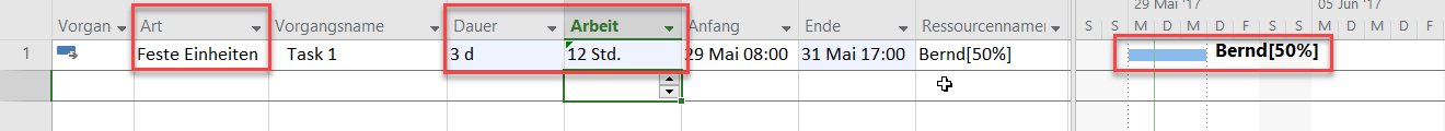 Kehren wir zur Ausgangssituation zurück und reduzieren das Arbeitsvolumen von 20 auf 12 Stunden, so berechnet MS Project eine Dauer von 3 Tagen, da Bernd ja fest mit 50% (4 Stunden pro Tag) eingeplant wird.