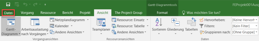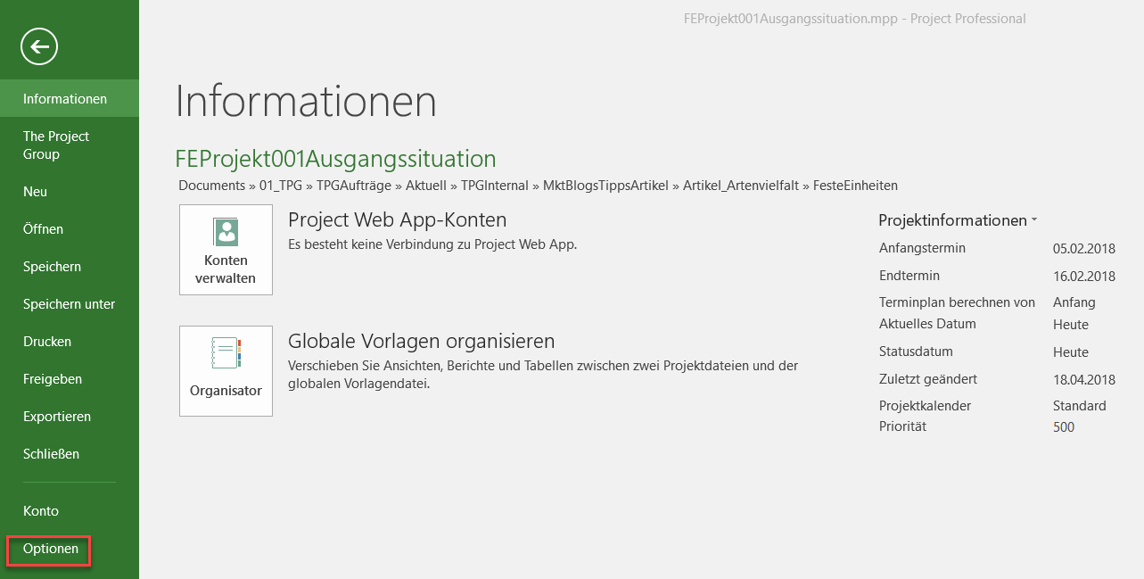 Die Standardvorgangsart können Sie in den Optionseinstellungen ändern. Durch einen Klick auf den Reiter Datei gelangen Sie zu der MS Project Seite Informationen.