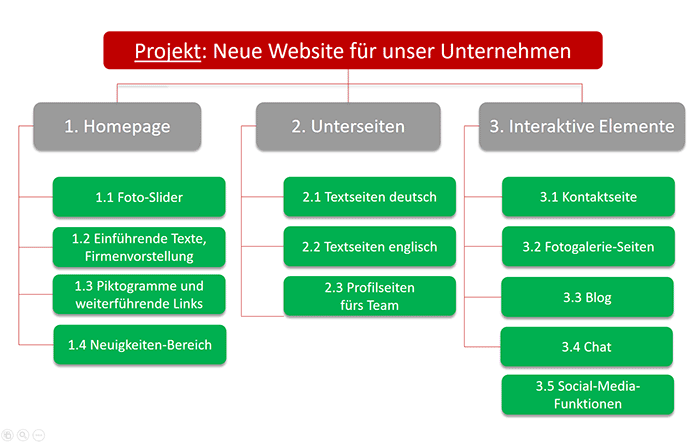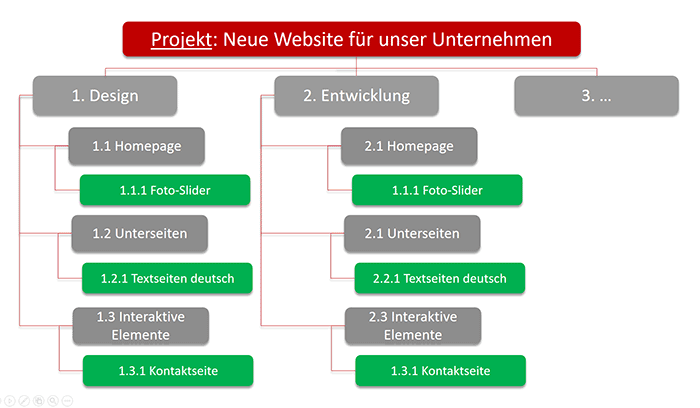 Hierbei legen Sie zunächst die oberen Ebenen der Gliederung fest und arbeiten sich dann langsam nach unten zur detaillierten Planung vor. Die einzelnen Arbeitspakete sind dabei der letzte logische Schritt.